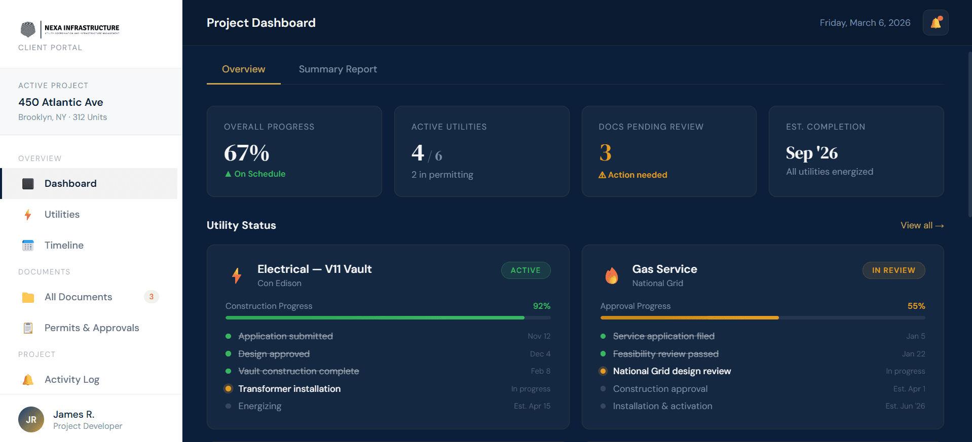 Nexa Portal gives developers and project teams a single, real-time dashboard to track permits, utilities, documents, and timelines — from groundbreaking to energization.