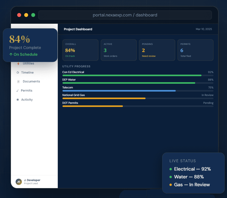 Track all project utility scopes — electric, water, gas, telecom via real-time updates, milestones, and transparency in the Nexa Client Portal.